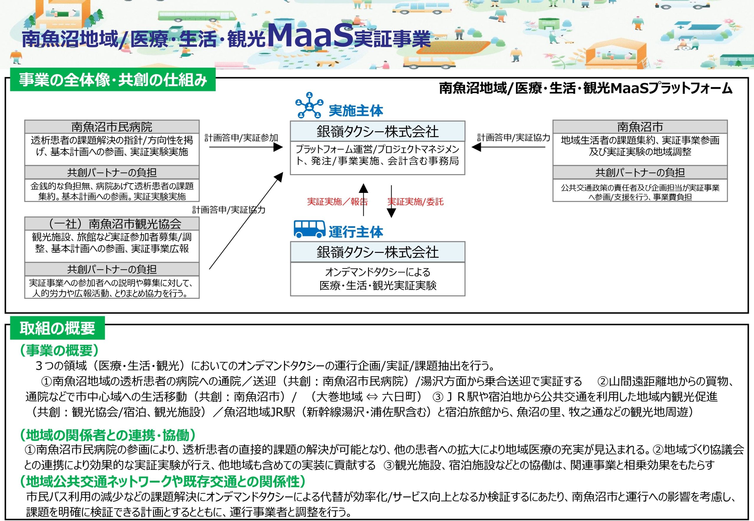 南魚沼市では、銀嶺タクシー株式会社を主体として、医療・生活・観光の3つの分野におけるMaaSの実証実験が行われています。この実証実験は、オンデマンドタクシーを利用して、透析患者、地域住民、観光客への移動サービスを提供し、その仕組みの構築、継続的な運営、採算性などを検証することを目的としています。また、この実証実験を通して得られたデータは、現在策定中の地域公共交通計画にも活用される予定です。